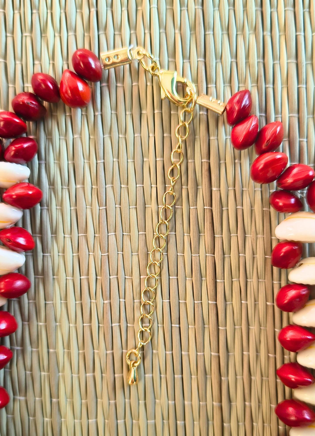Matières: Cauris naturels, graines de pipiti’o popa’a (Adenanthera pavonina), attache en acier inoxydable