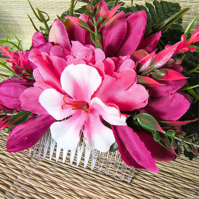 Comme un bouquet lumineux posé dans les cheveux, ce po’ara se distingue par son cœur clair entouré de fleurs aux nuances de rose profond et de feuillages structurés. L’ensemble crée un équilibre subtil entre douceur et intensité, apportant à la coiffure une présence élégante et expressive.