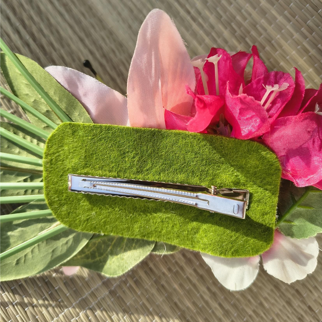 Matières : fleurs et feuillages artificiels, pince crocodile de 8 cm, feutrine